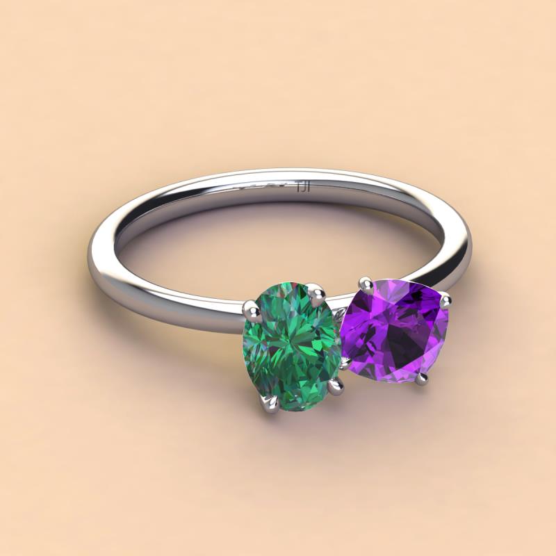Two-stone Duo ring featuring an Oval shape Lab Created Alexandrite and Cushion shape Amethyst crafted beautifully that will effortlessly blend with her casual outfits and evening dresses.