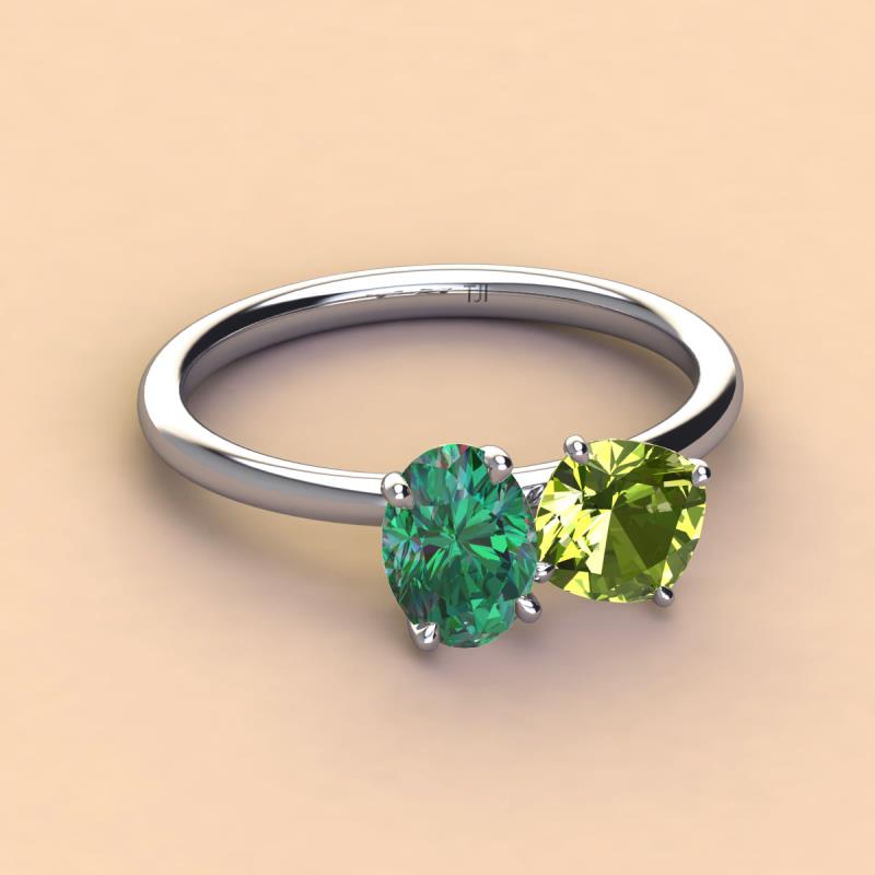Two-stone Duo ring featuring an Oval shape Lab Created Alexandrite and Cushion shape Peridot crafted beautifully that will effortlessly blend with her casual outfits and evening dresses.