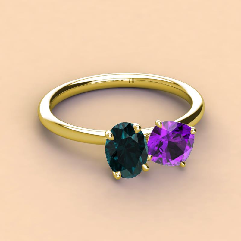 Two-stone Duo ring featuring an Oval shape London Blue Topaz and Cushion shape Amethyst crafted beautifully that will effortlessly blend with her casual outfits and evening dresses.