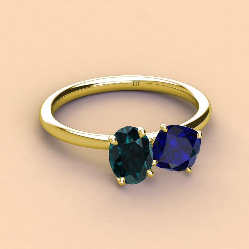 Two-stone Duo ring featuring an Oval shape London Blue Topaz and Cushion Shape Blue Sapphire crafted beautifully that will effortlessly blend with her casual outfits and evening dresses.