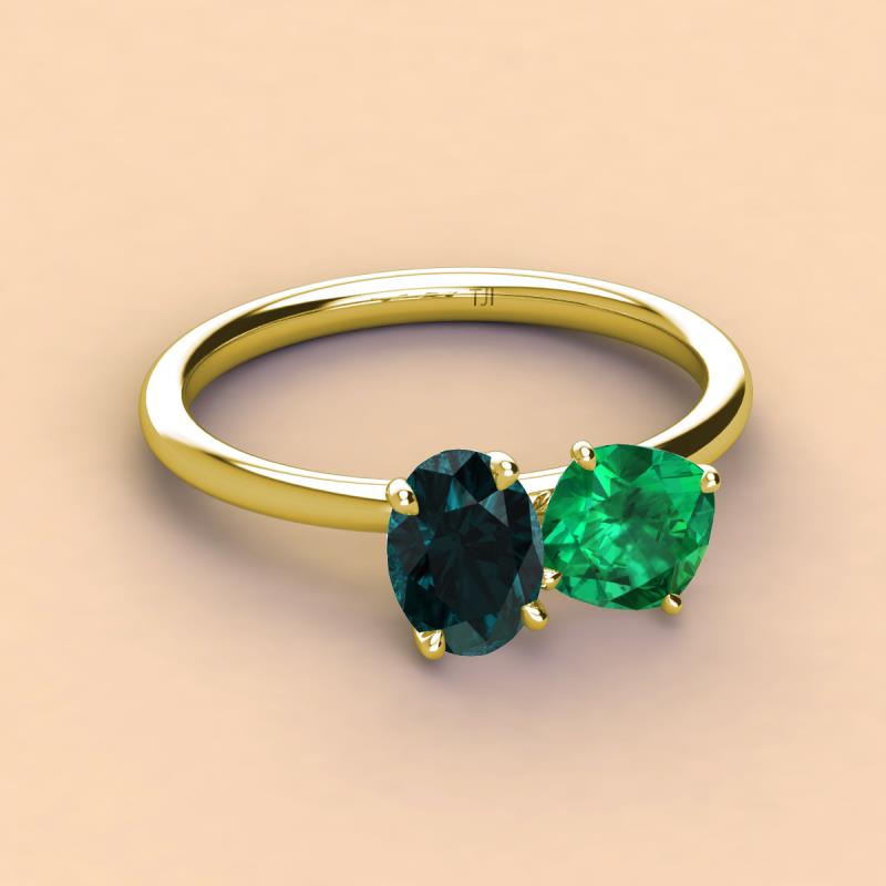 Two-stone Duo ring featuring an Oval shape London Blue Topaz and Cushion Shape Emerald crafted beautifully that will effortlessly blend with her casual outfits and evening dresses.