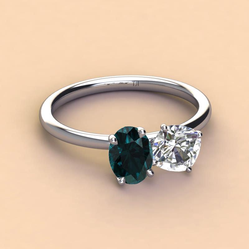 Two-stone Duo ring featuring an Oval shape London Blue Topaz and Cushion shape GIA Certified Diamond crafted beautifully that will effortlessly blend with her casual outfits and evening dresses.