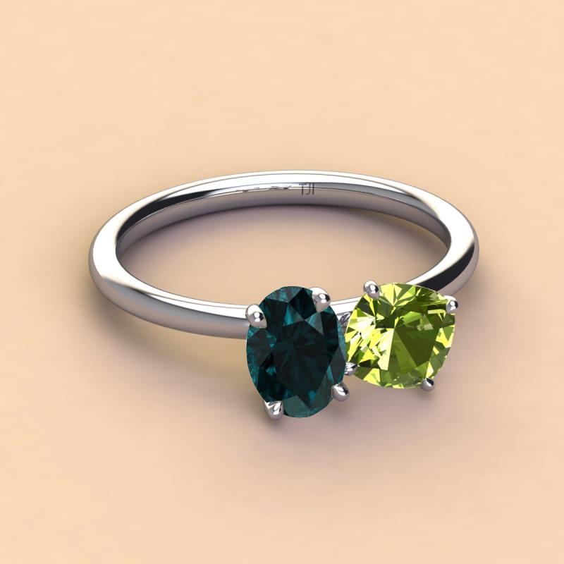 Two-stone Duo ring featuring an Oval shape London Blue Topaz and Cushion shape Peridot crafted beautifully that will effortlessly blend with her casual outfits and evening dresses.