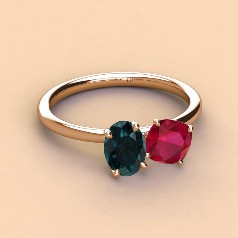 Two-stone Duo ring featuring an Oval shape London Blue Topaz and Cushion Shape Ruby crafted beautifully that will effortlessly blend with her casual outfits and evening dresses.
