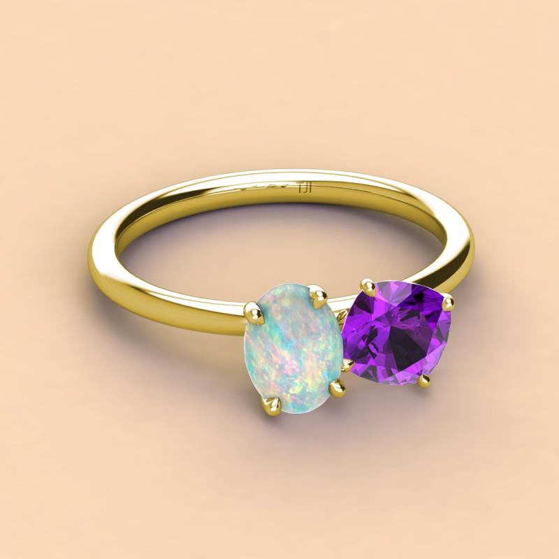 Two-stone Duo ring featuring an Oval shape Opal and Cushion shape Amethyst crafted beautifully that will effortlessly blend with her casual outfits and evening dresses.
