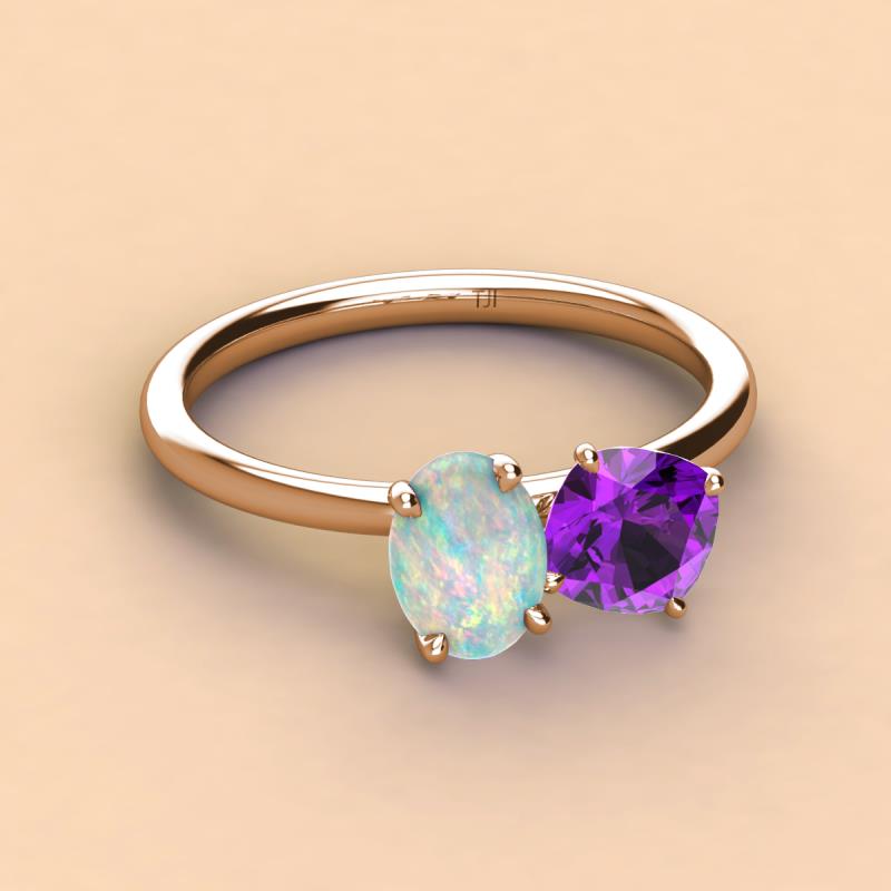 Two-stone Duo ring featuring an Oval shape Opal and Cushion shape Amethyst crafted beautifully that will effortlessly blend with her casual outfits and evening dresses.
