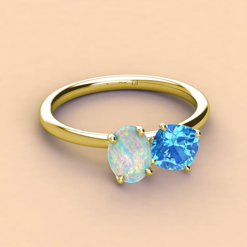 Two-stone Duo ring featuring an Oval shape Opal and Cushion shape Blue Topaz crafted beautifully that will effortlessly blend with her casual outfits and evening dresses.
