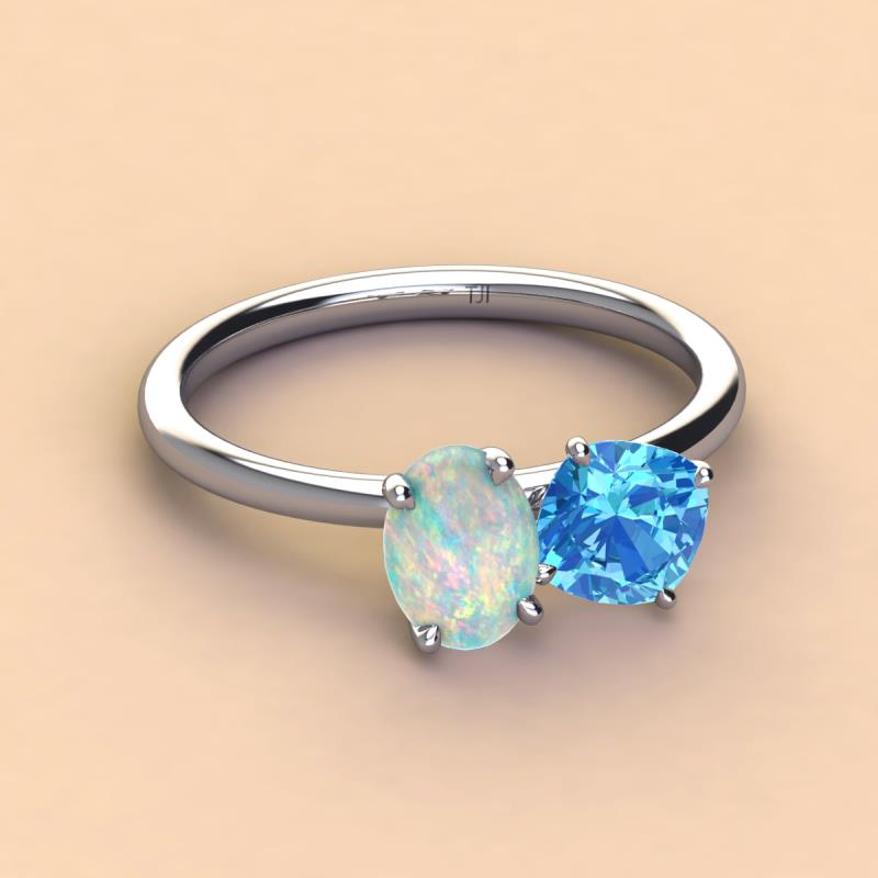 Two-stone Duo ring featuring an Oval shape Opal and Cushion shape Blue Topaz crafted beautifully that will effortlessly blend with her casual outfits and evening dresses.