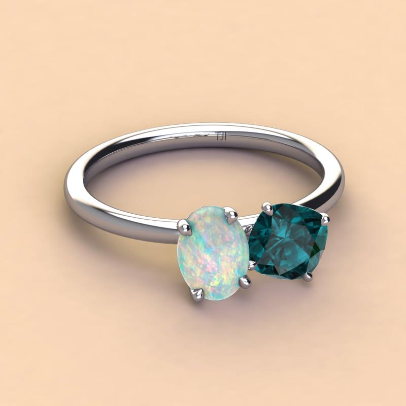 Two-stone Duo ring featuring an Oval shape Opal and Cushion shape London Blue Topaz crafted beautifully that will effortlessly blend with her casual outfits and evening dresses.