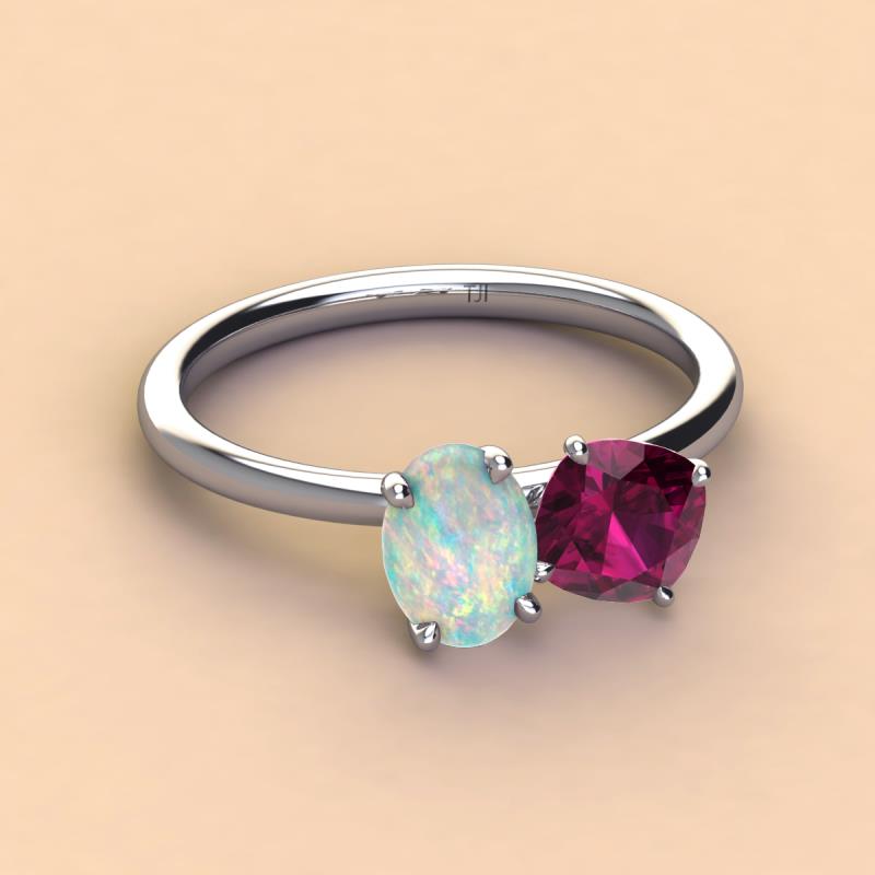 Two-stone Duo ring featuring an Oval shape Opal and Cushion shape Rhodolite Garnet crafted beautifully that will effortlessly blend with her casual outfits and evening dresses.