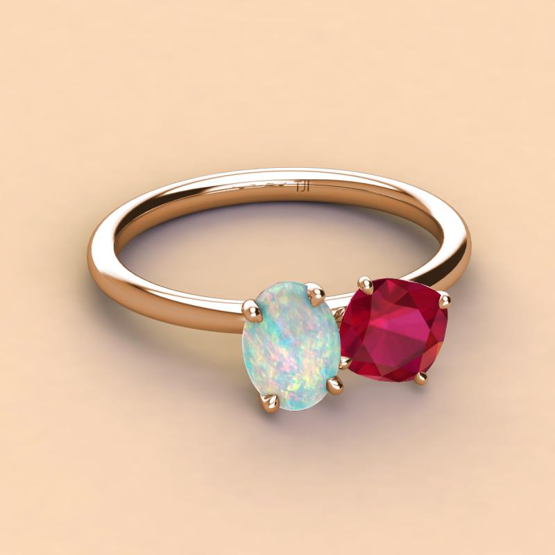 Two-stone Duo ring featuring an Oval shape Opal and Cushion shape Ruby crafted beautifully that will effortlessly blend with her casual outfits and evening dresses.