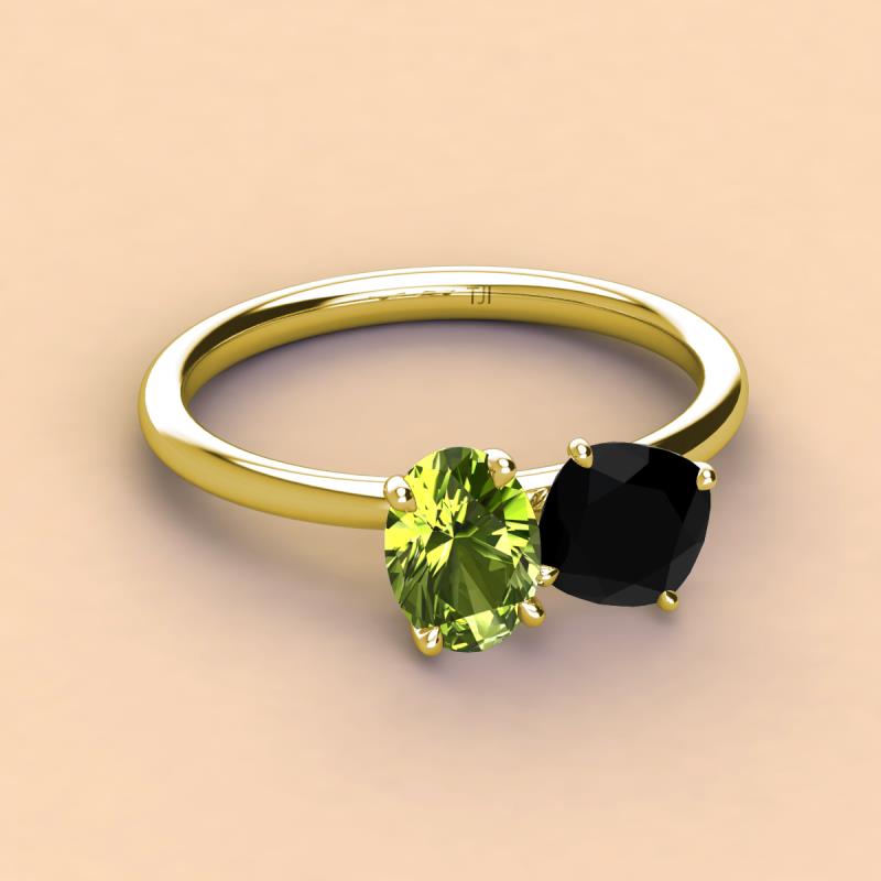 Two-stone Duo ring featuring an Oval shape Peridot and Cushion shape Black Onyx crafted beautifully that will effortlessly blend with her casual outfits and evening dresses.