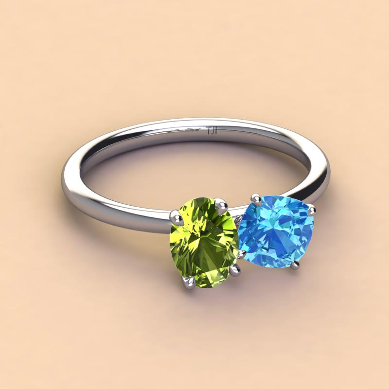Two-stone Duo ring featuring an Oval shape Peridot and Cushion shape Blue Topaz crafted beautifully that will effortlessly blend with her casual outfits and evening dresses.