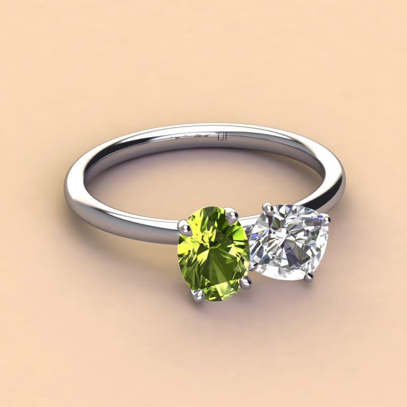 Two-stone Duo ring featuring an Oval shape Peridot and Cushion shape GIA Certified Diamond crafted beautifully that will effortlessly blend with her casual outfits and evening dresses.