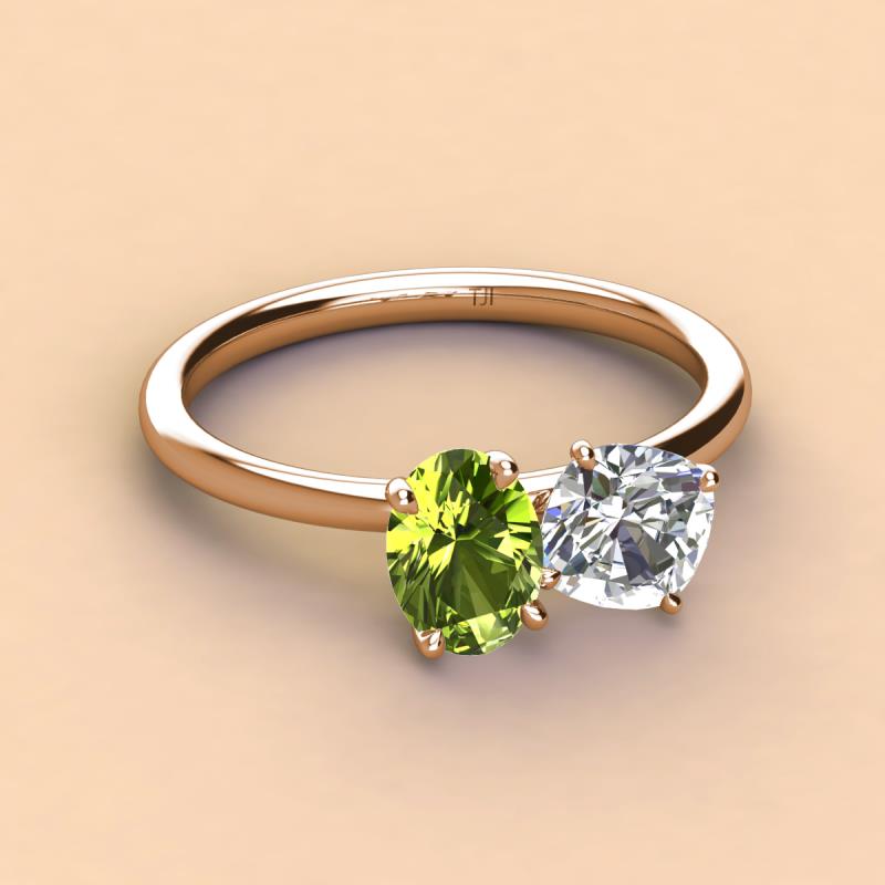Two-stone Duo ring featuring an Oval shape Peridot and Cushion shape IGI Certified Lab Grown Diamond crafted beautifully that will effortlessly blend with her casual outfits and evening dresses.