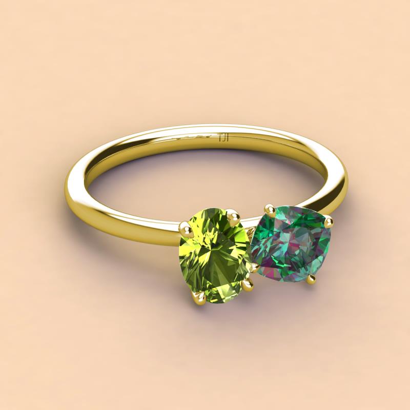 Two-stone Duo ring featuring an Oval shape Peridot and Cushion shape Lab Created Alexandrite crafted beautifully that will effortlessly blend with her casual outfits and evening dresses.