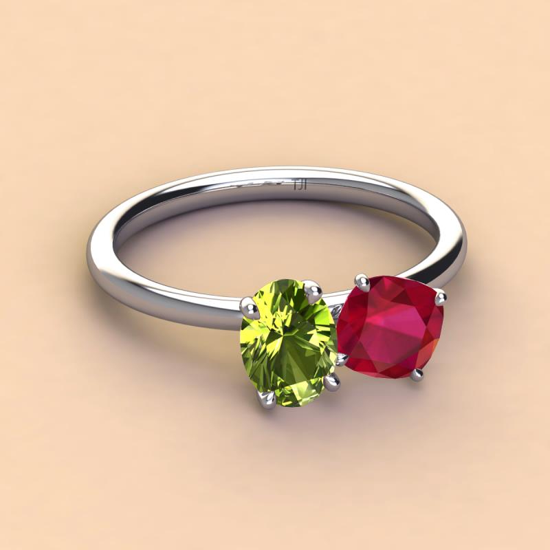 Two-stone Duo ring featuring an Oval shape Peridot and Cushion Shape Ruby crafted beautifully that will effortlessly blend with her casual outfits and evening dresses.