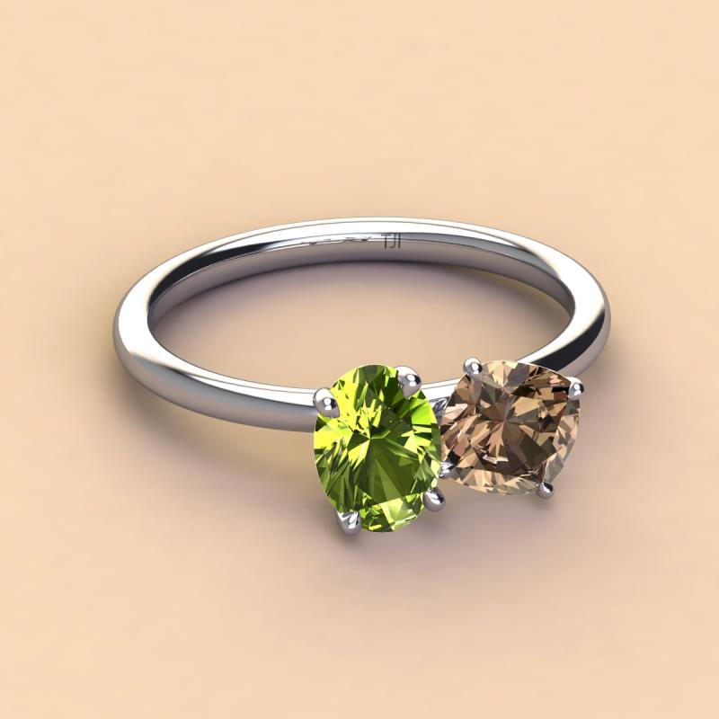 Two-stone Duo ring featuring an Oval shape Peridot and Cushion shape Smoky Quartz crafted beautifully that will effortlessly blend with her casual outfits and evening dresses.