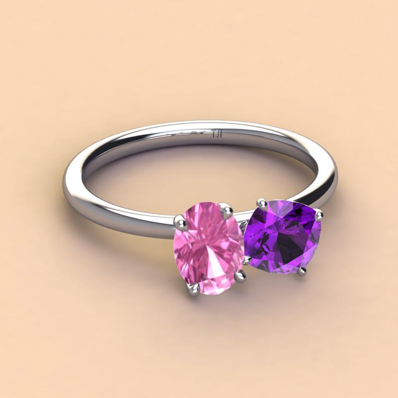 Two-stone Duo ring featuring an Oval shape Pink Sapphire and Cushion shape Amethyst crafted beautifully that will effortlessly blend with her casual outfits and evening dresses.