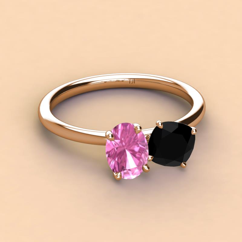 Two-stone Duo ring featuring an Oval shape Pink Sapphire and Cushion shape Black Onyx crafted beautifully that will effortlessly blend with her casual outfits and evening dresses.