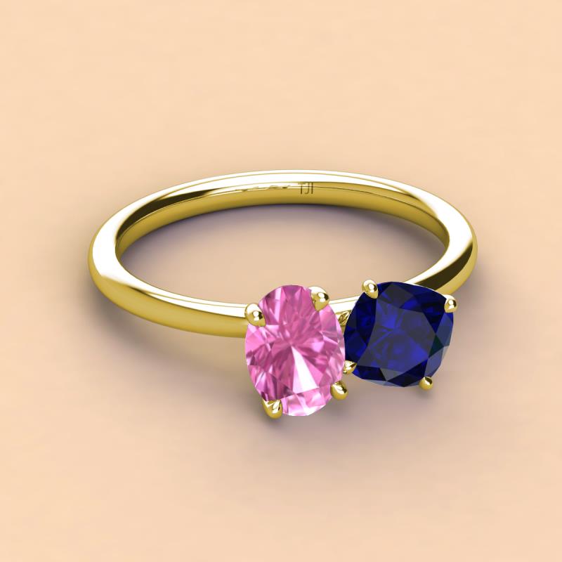 Two-stone Duo ring featuring an Oval shape Pink Sapphire and Cushion shape Blue Sapphire crafted beautifully that will effortlessly blend with her casual outfits and evening dresses.