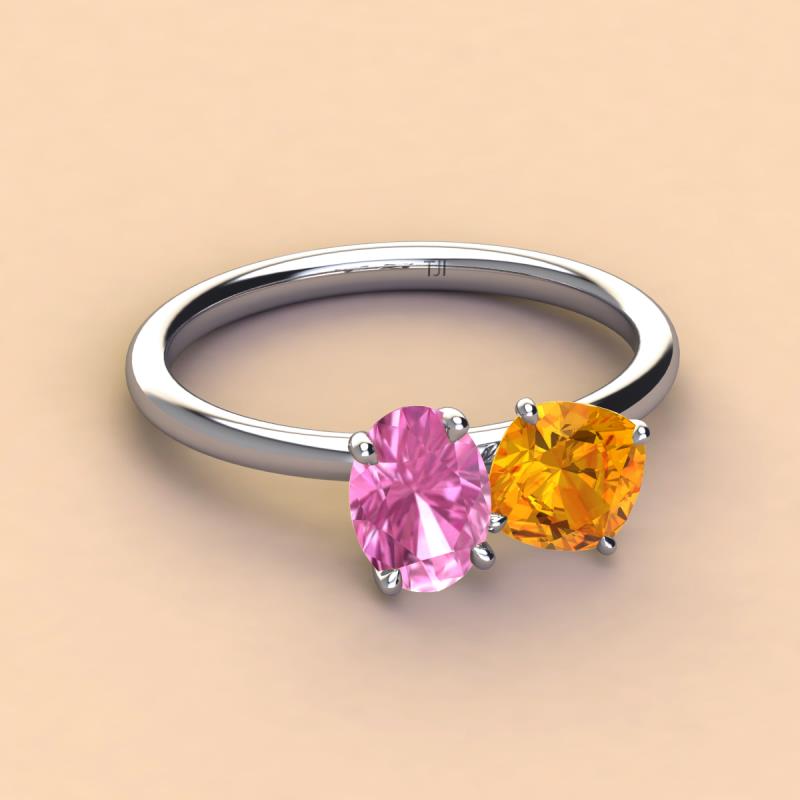 Two-stone Duo ring featuring an Oval shape Pink Sapphire and Cushion shape Citrine crafted beautifully that will effortlessly blend with her casual outfits and evening dresses.