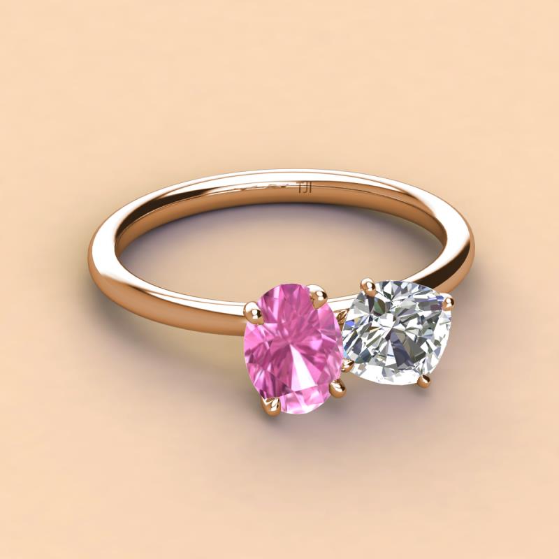 Two-stone Duo ring featuring an Oval shape Pink Sapphire and Cushion shape GIA Certified Diamond crafted beautifully that will effortlessly blend with her casual outfits and evening dresses.
