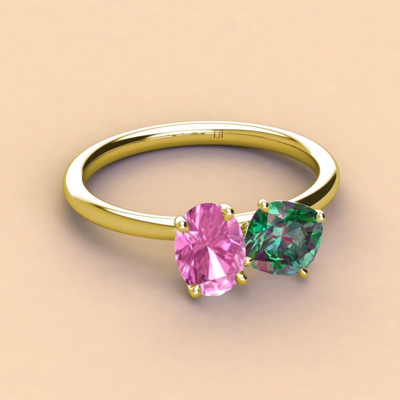 Two-stone Duo ring featuring an Oval shape Pink Sapphire and Cushion shape Lab Created Alexandrite crafted beautifully that will effortlessly blend with her casual outfits and evening dresses.