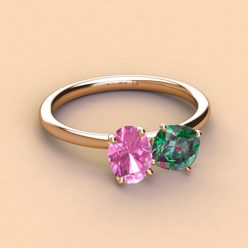 Two-stone Duo ring featuring an Oval shape Pink Sapphire and Cushion shape Lab Created Alexandrite crafted beautifully that will effortlessly blend with her casual outfits and evening dresses.
