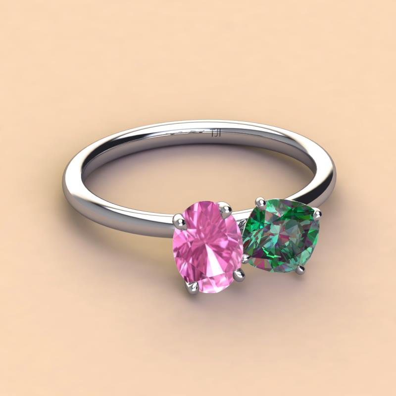 Two-stone Duo ring featuring an Oval shape Pink Sapphire and Cushion shape Lab Created Alexandrite crafted beautifully that will effortlessly blend with her casual outfits and evening dresses.