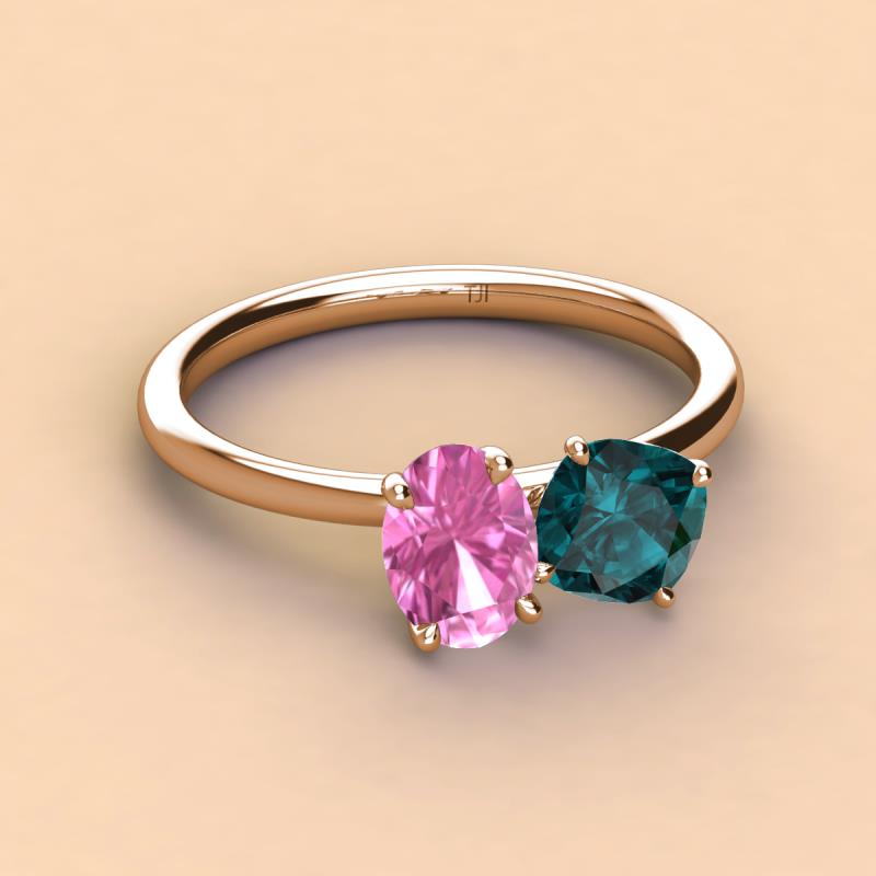 Two-stone Duo ring featuring an Oval shape Pink Sapphire and Cushion shape London Blue Topaz crafted beautifully that will effortlessly blend with her casual outfits and evening dresses.