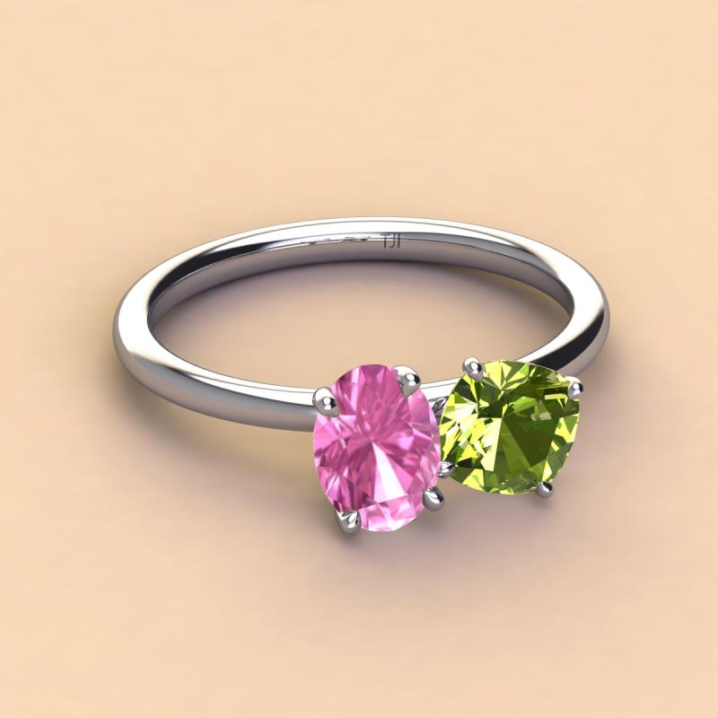 Two-stone Duo ring featuring an Oval shape Pink Sapphire and Cushion shape Peridot crafted beautifully that will effortlessly blend with her casual outfits and evening dresses.