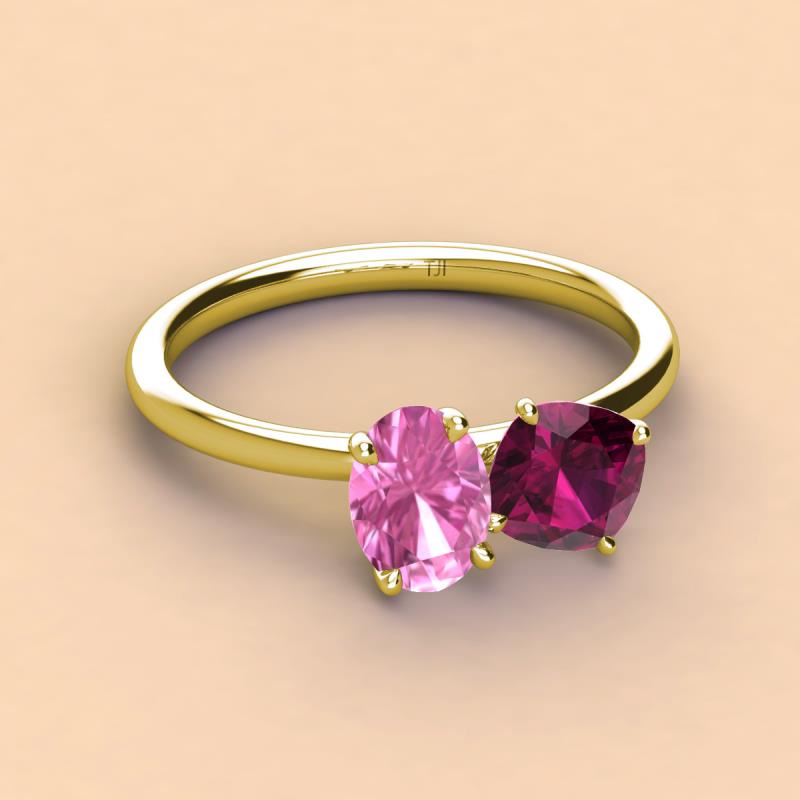 Two-stone Duo ring featuring an Oval shape Pink Sapphire and Cushion shape Rhodolite Garnet crafted beautifully that will effortlessly blend with her casual outfits and evening dresses.