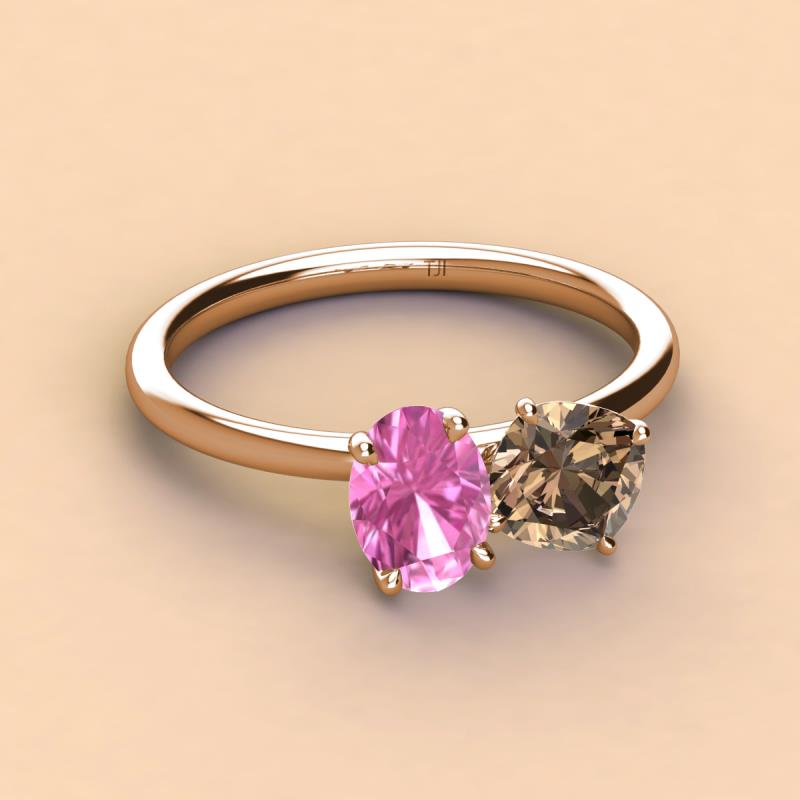 Two-stone Duo ring featuring an Oval shape Pink Sapphire and Cushion shape Smoky Quartz crafted beautifully that will effortlessly blend with her casual outfits and evening dresses.