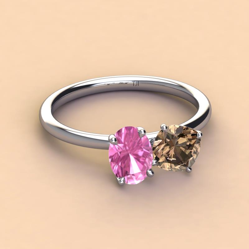 Two-stone Duo ring featuring an Oval shape Pink Sapphire and Cushion shape Smoky Quartz crafted beautifully that will effortlessly blend with her casual outfits and evening dresses.