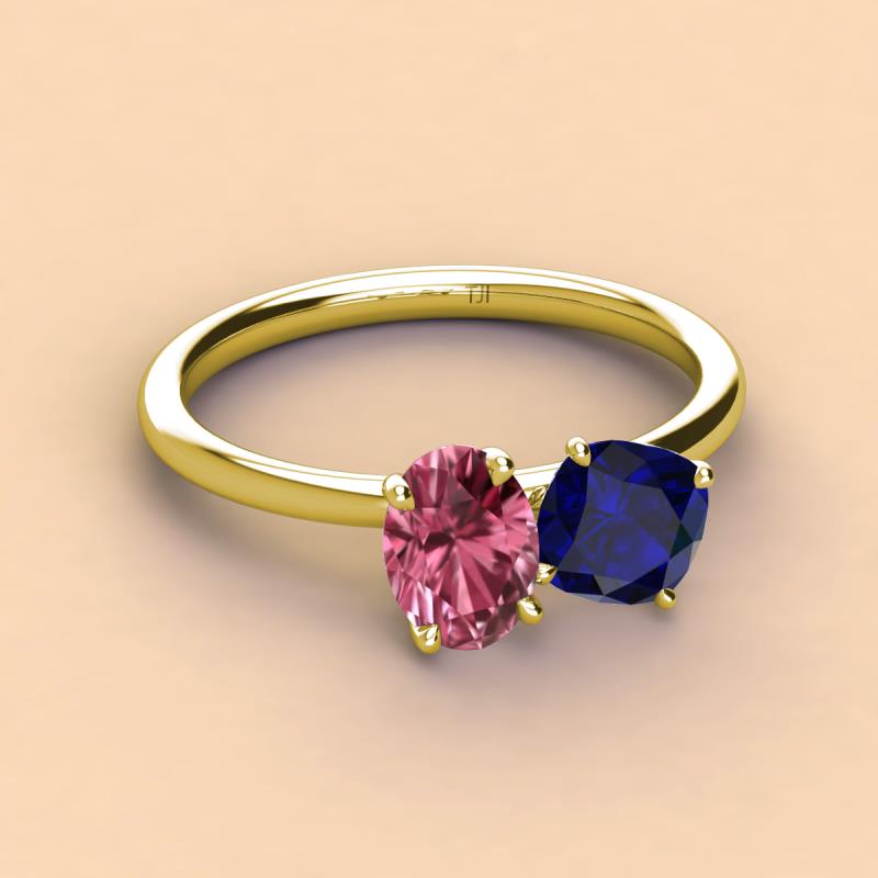 Two-stone Duo ring featuring an Oval shape Pink Tourmaline and Cushion shape Blue Sapphire crafted beautifully that will effortlessly blend with her casual outfits and evening dresses.