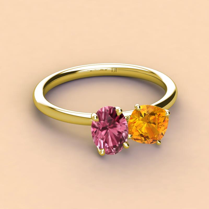 Two-stone Duo ring featuring an Oval shape Pink Tourmaline and Cushion shape Citrine crafted beautifully that will effortlessly blend with her casual outfits and evening dresses.