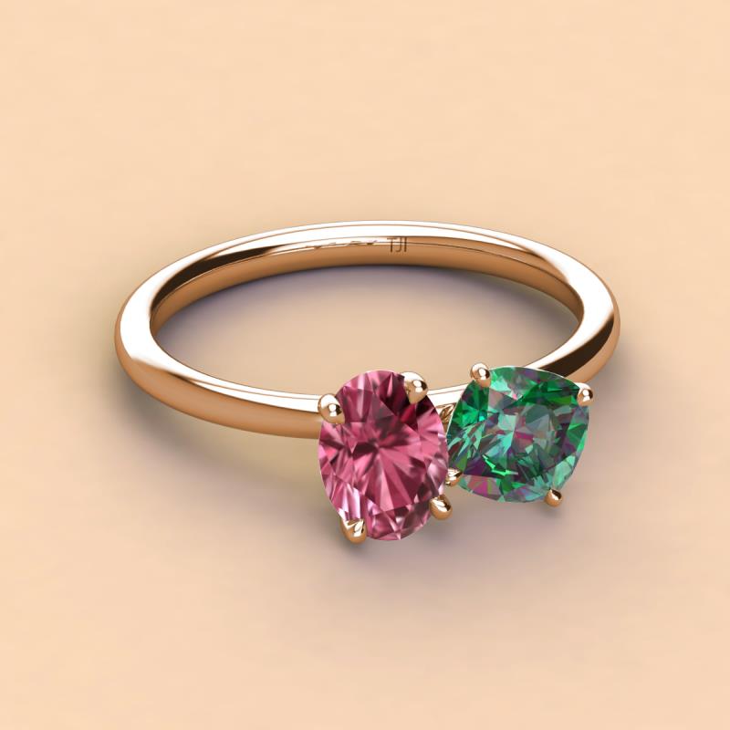 Two-stone Duo ring featuring an Oval shape Pink Tourmaline and Cushion shape Lab Created Alexandrite crafted beautifully that will effortlessly blend with her casual outfits and evening dresses.