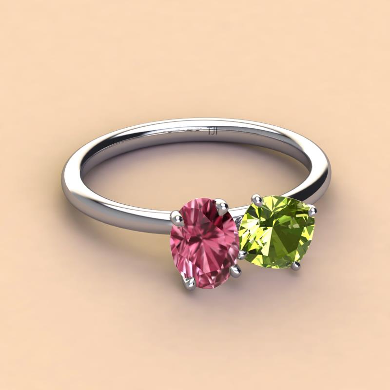 Two-stone Duo ring featuring an Oval shape Pink Tourmaline and Cushion shape Peridot crafted beautifully that will effortlessly blend with her casual outfits and evening dresses.
