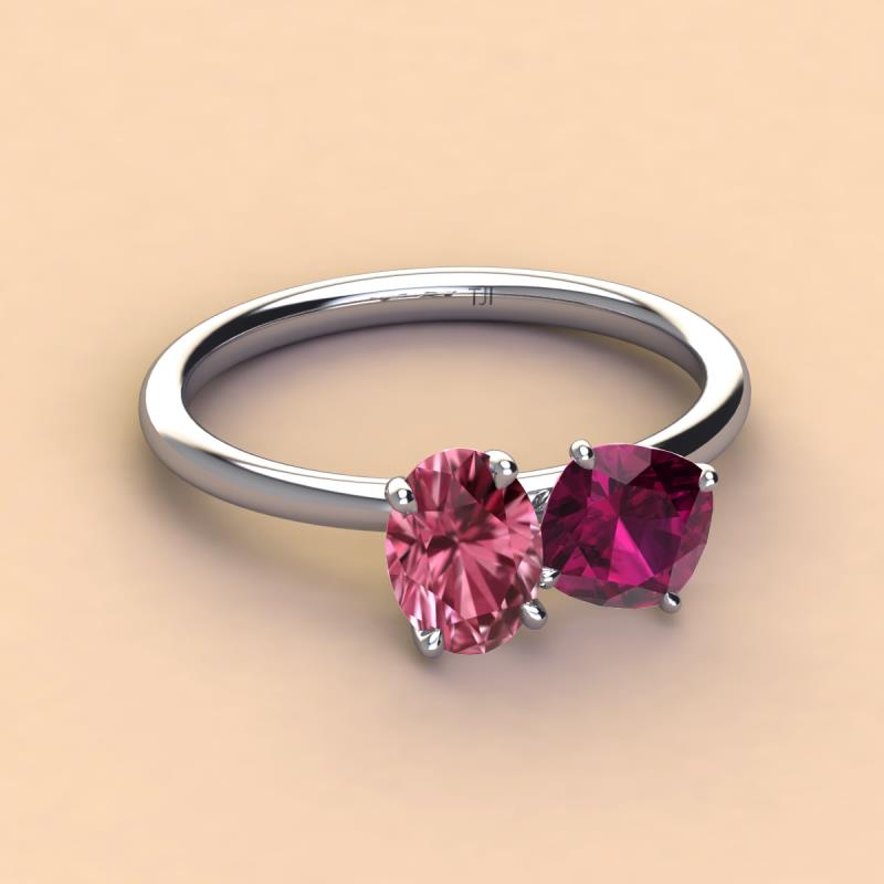 Two-stone Duo ring featuring an Oval shape Pink Tourmaline and Cushion shape Rhodolite Garnet crafted beautifully that will effortlessly blend with her casual outfits and evening dresses.