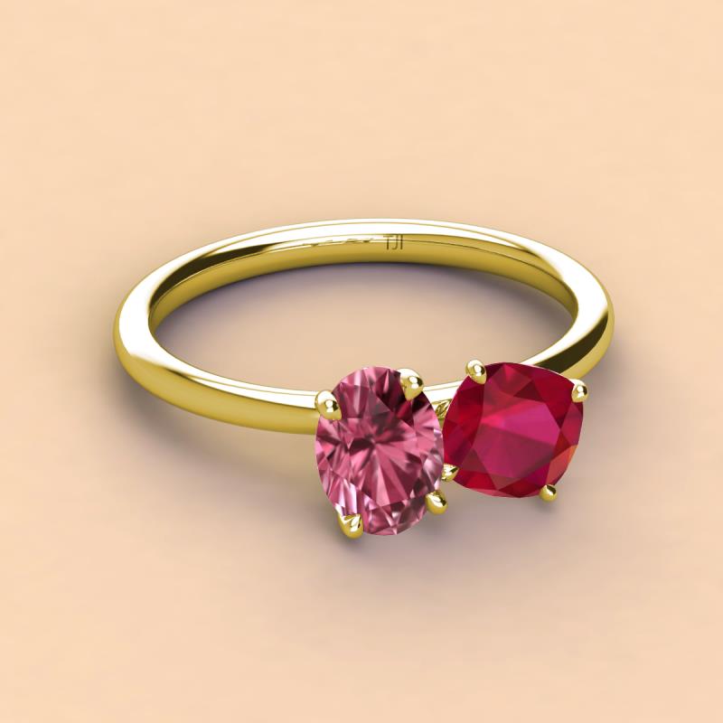 Two-stone Duo ring featuring an Oval shape Pink Tourmaline and Cushion shape Ruby crafted beautifully that will effortlessly blend with her casual outfits and evening dresses.