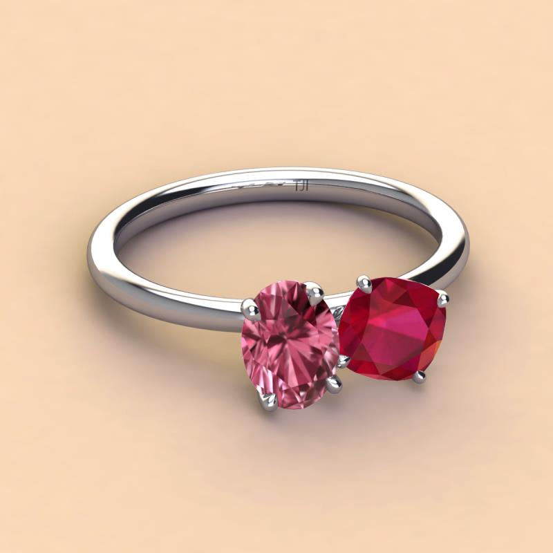 Two-stone Duo ring featuring an Oval shape Pink Tourmaline and Cushion shape Ruby crafted beautifully that will effortlessly blend with her casual outfits and evening dresses.
