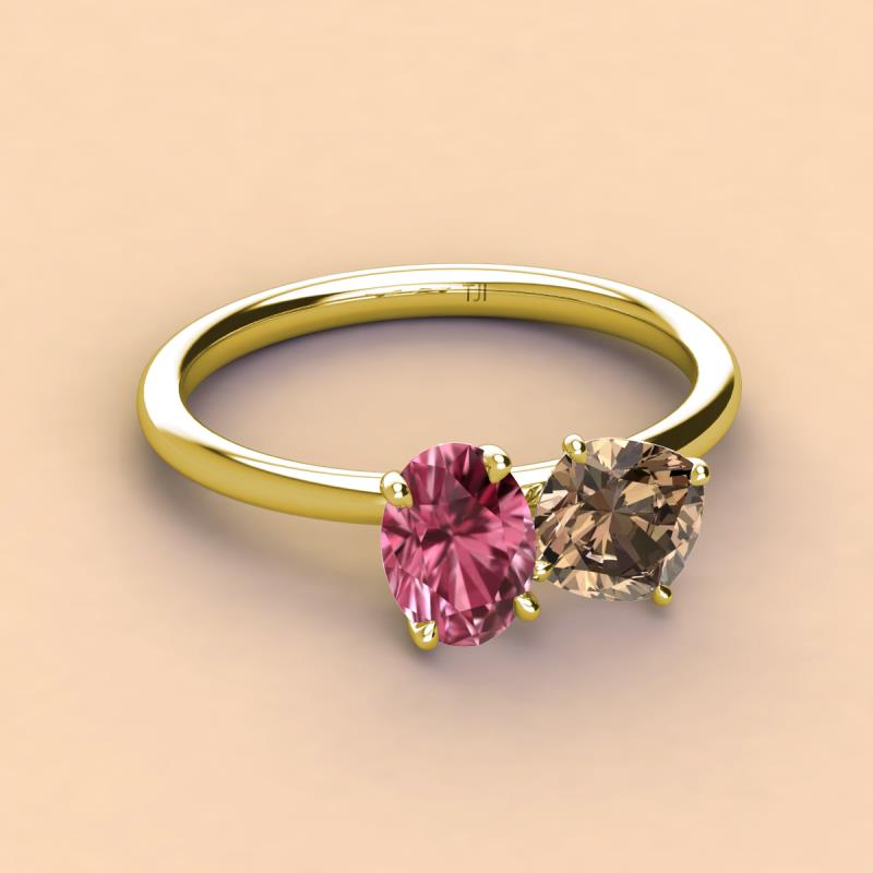 Two-stone Duo ring featuring an Oval shape Pink Tourmaline and Cushion shape Smoky Quartz crafted beautifully that will effortlessly blend with her casual outfits and evening dresses.