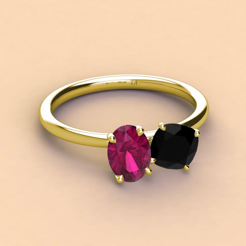 Two-stone Duo ring featuring an Oval shape Rhodolite Garnet and Cushion shape Black Onyx crafted beautifully that will effortlessly blend with her casual outfits and evening dresses.