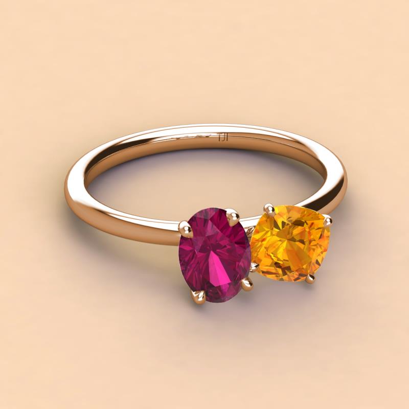 Two-stone Duo ring featuring an Oval shape Rhodolite Garnet and Cushion shape Citrine crafted beautifully that will effortlessly blend with her casual outfits and evening dresses.