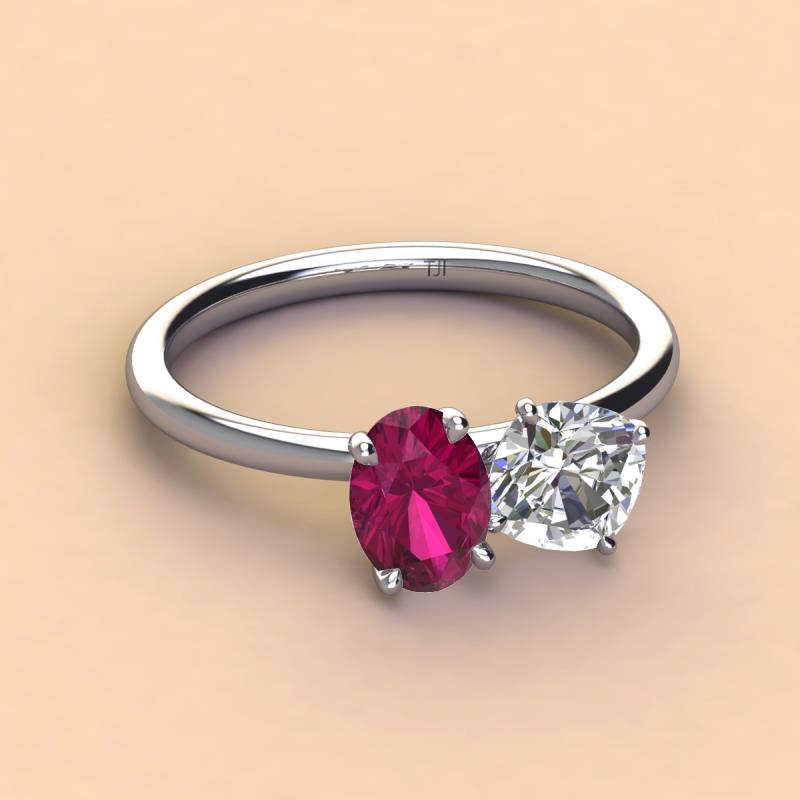 Two-stone Duo ring featuring an Oval shape Rhodolite Garnet and Cushion shape Forever One Moissanite crafted beautifully that will effortlessly blend with her casual outfits and evening dresses.