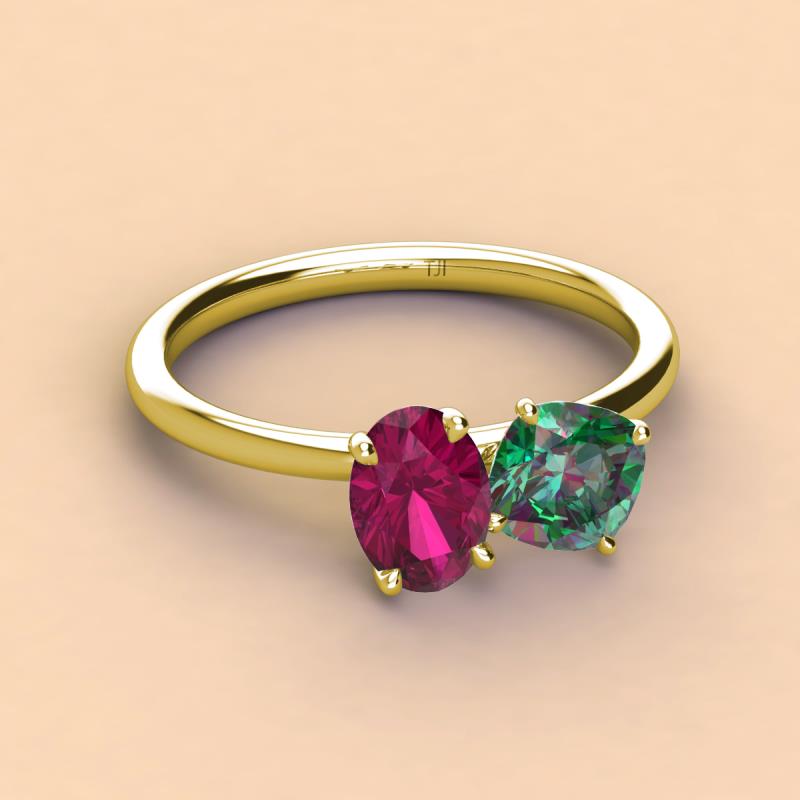 Two-stone Duo ring featuring an Oval shape Rhodolite Garnet and Cushion shape Lab Created Alexandrite crafted beautifully that will effortlessly blend with her casual outfits and evening dresses.