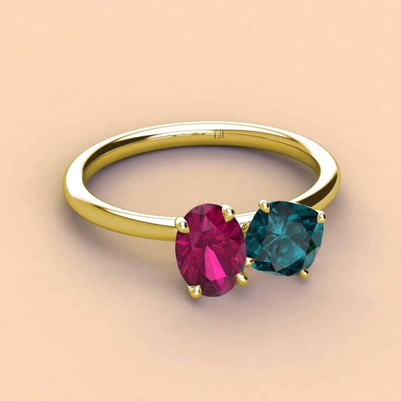 Two-stone Duo ring featuring an Oval shape Rhodolite Garnet and Cushion shape London Blue Topaz crafted beautifully that will effortlessly blend with her casual outfits and evening dresses.