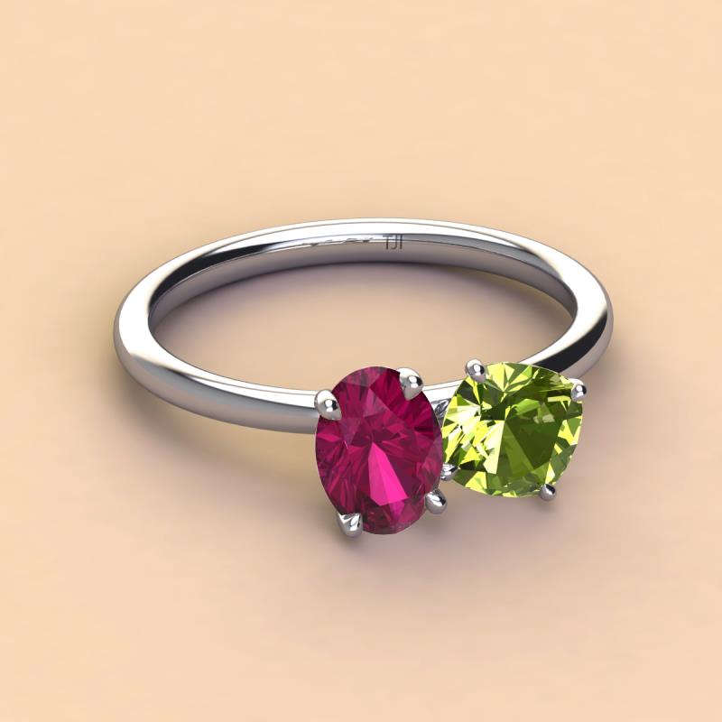 Two-stone Duo ring featuring an Oval shape Rhodolite Garnet and Cushion shape Peridot crafted beautifully that will effortlessly blend with her casual outfits and evening dresses.