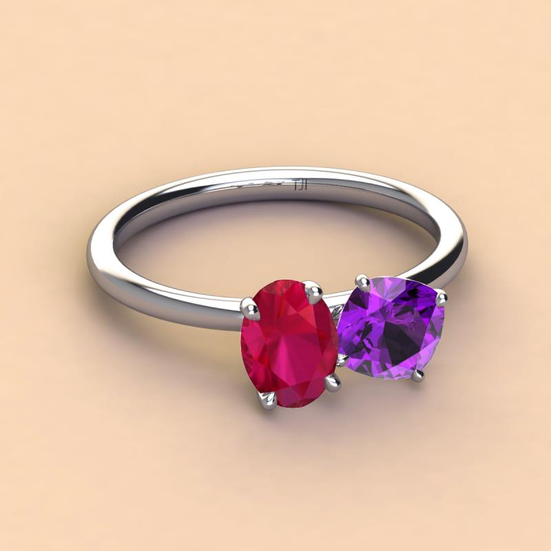 Two-stone Duo ring featuring an Oval shape Ruby and Cushion shape Amethyst crafted beautifully that will effortlessly blend with her casual outfits and evening dresses.